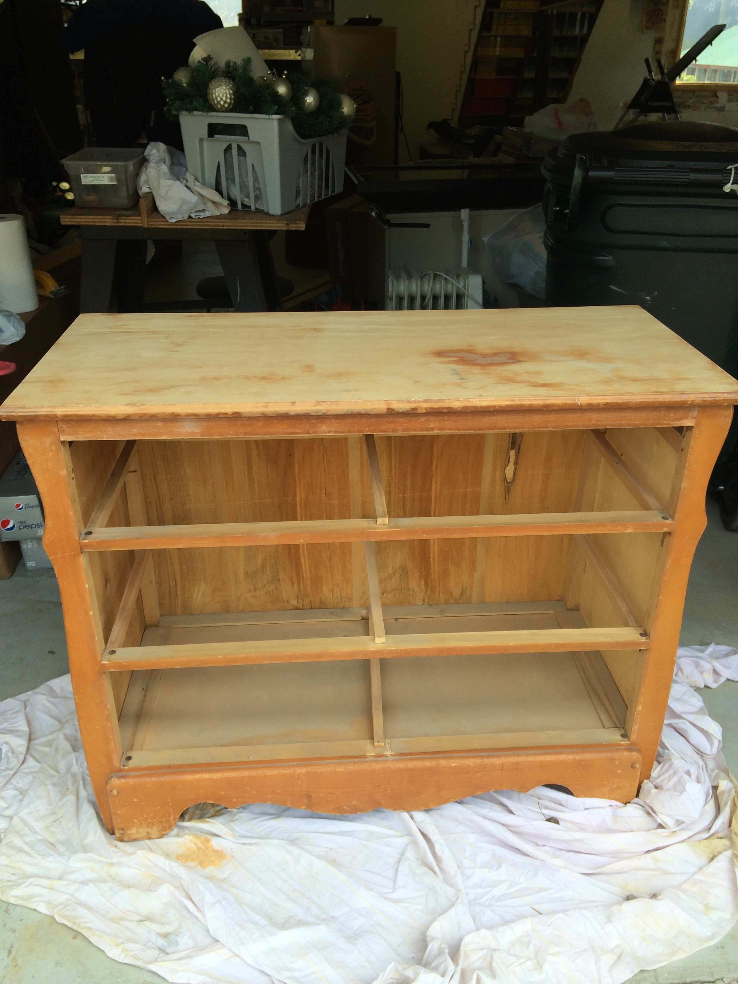 So first, you need a dresser. I actually found this dresser at my parent’s house. It was not being used, and my mom was happy to let me take it for my project (She’s trying to de-clutterize their life, now that all us kids have moved out!) . If you don’t have parents that want to give things away, check out your local thrift shops, or garage sales. The whole point of these projects is to be super cheap and save money. So don’t pay crazy amounts of money for a piece of furniture that you are going to re-paint. I would say that a budget for a dresser is $20. Here is what the dresser looked like when I started: It was the boring wood color that I hate.