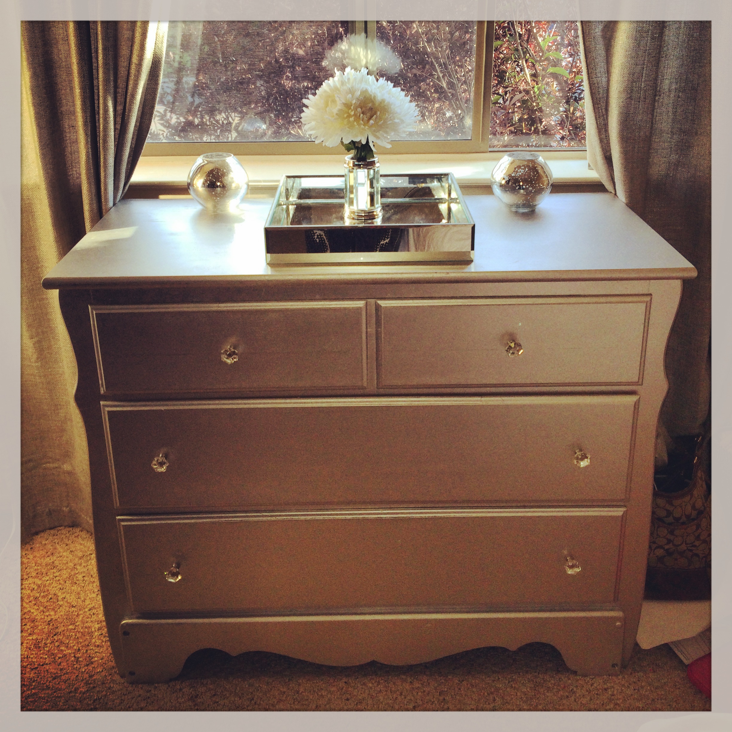 Things You Need: a dresser (preferably used), silver spray paint, crystal knobs